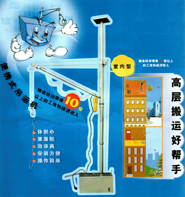 便攜式小吊機是誕生于世紀(jì)之初的新產(chǎn)品,它體積小、重量輕,一個人自行車就能攜帶;它吊的高、速度快,30層樓房8分鐘就能打來回;它便于安裝、起重大、容易操作、效率高;它投資小、見效快、零風(fēng)險、高回報它的問世是當(dāng)今建筑裝潢行業(yè)機械運料的重大突破,從此將結(jié)束高空裝潢材料依靠人工搬運的歷史。它極大地減輕了勞動強度,最大地創(chuàng)造了經(jīng)濟效益。