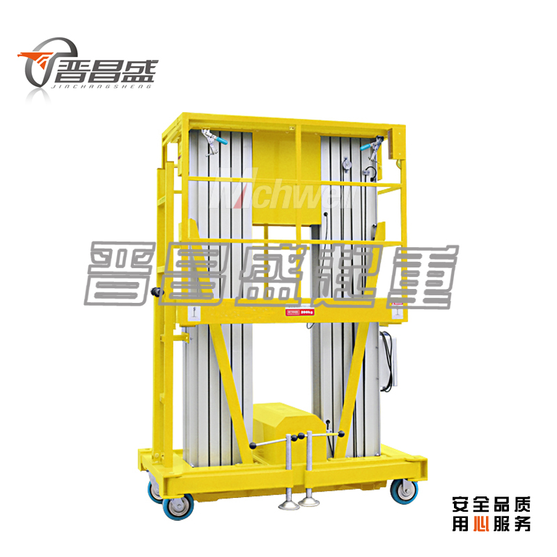 兩組桅柱支撐作業(yè)平臺同步升降,具有優(yōu)秀的工作穩(wěn)定性;整體升降式護欄裝置,強度好