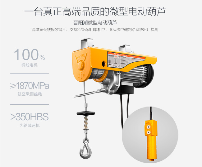 晉陽湖微型電動葫蘆220v室內(nèi)家用裝修小吊機室外吊運機卷揚機起重 純銅電機 航空級鋼絲繩 30天免費換新機 365天免費電機保修 終身供應(yīng)配件 硬齒面減速齒輪 承載能力強 高磁感低鐵損轉(zhuǎn)子矽鋼片